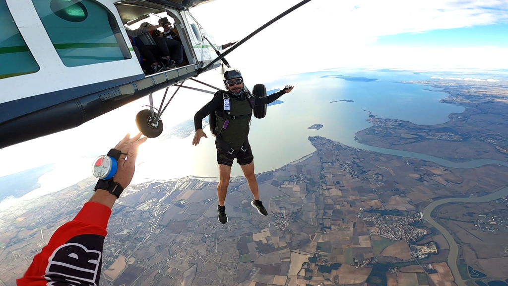 Vient ensuite le premier saut accompagné, l’un des moments les plus marquants du stage. À 4 000 mètres d’altitude, vous quittez l’avion accompagné de deux moniteurs qui vous aident à stabiliser votre chute libre, à exécuter les premiers exercices et à prendre conscience de l’air relatif. Les sauts suivants se déroulent avec un seul moniteur, qui vous guide vers une autonomie croissante.